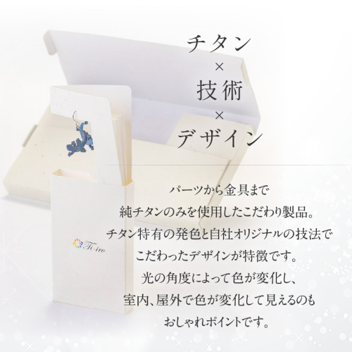 パーツから金具まで純チタンのみを使用したこだわり製品。 チタン特有の発色と自社オリジナルの技法でこだわったデザインが特徴です。