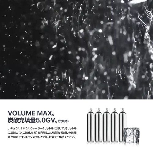炭酸充填量5.0GV(充填直後)、VOLUME MAXの無糖炭酸水。