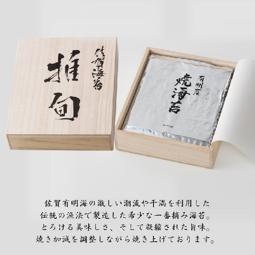 佐賀有明海の激しい潮流や干満を利用した伝統の漁法で製造した希少な一番摘み海苔。 とろける美味しさ、そして凝縮された旨味。 焼き加減を調整しながら焼き上げております。 使用する海苔は有明佐賀漁連準拠”推1等級”以上で特に旨みの強い海苔を使用しています。 おいしい佐賀海苔をご賞味下さい。 ※12月上旬より順次発送いたします。 【原材料】板のり(佐賀有明産) 【地場産品基準のうち該当する類型:告示第5条第3号】 上記類型に該当する理由 市内で製造されたもの
