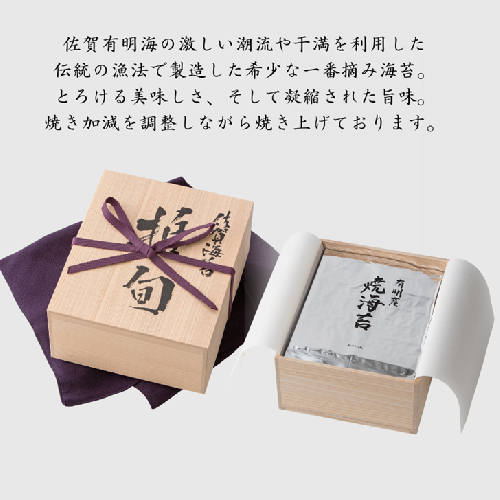 佐賀有明海の激しい潮流や干満を利用した伝統の漁法で製造した希少な一番摘み海苔。 とろける美味しさ、そして凝縮された旨味。 焼き加減を調整しながら焼き上げております。 使用する海苔は有明佐賀漁連準拠”推1等級”以上で特に旨みの強い海苔を使用しています。 おいしい佐賀海苔をご賞味下さい。 ※12月上旬より順次発送いたします。 【原材料】板のり(佐賀有明産) 【地場産品基準のうち該当する類型:告示第5条第3号】 上記類型に該当する理由  市内で製造されたもの