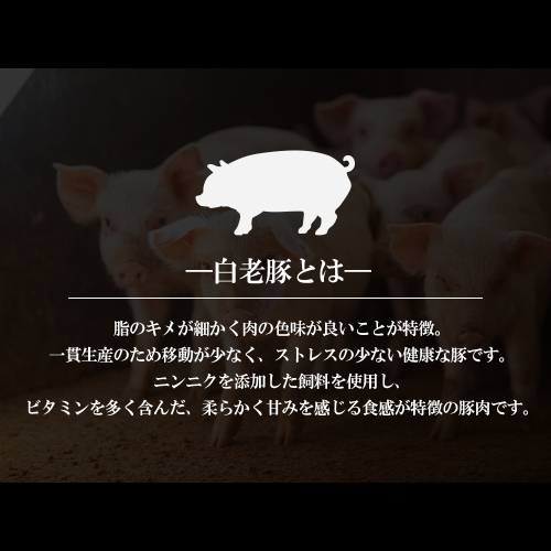 ◆白老豚は豚特有の臭みがなく、さっぱりした脂とジューシーな赤身が特徴。 ◆柔らかく、調理しても肉の甘みがしっかり感じられます。 ◆スジ切りの処理済ですので、フォークで穴をあける手間が不要。柔らかく仕上がります。 ~白老豚とは~ 脂のキメが細かく肉の色味が良いことが特徴。 一貫生産のため移動が少なく、ストレスの少ない健康な豚です。 ニンニクを添加した飼料を使用し、ビタミンを多く含んだ、柔らかく甘みを感じる食感が特徴の豚肉です。