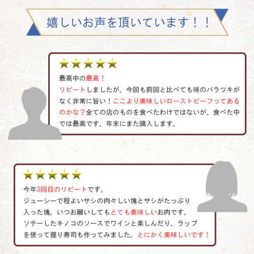 とても美味しいローストビーフでした。今まで注文した中で一番柔らかくて食べ応えも十分でした。リピ確定です。