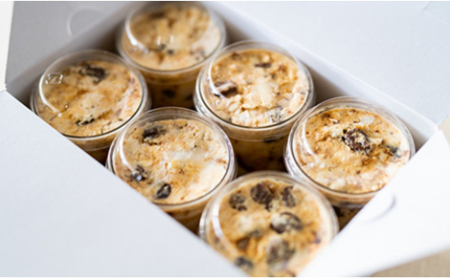香ばしいクルミとアーモンドをキャラメルでコーティングした「プラリネ」と香り高い洋酒でマリネしたレーズンを厳選した生クリームとメレンゲで合わせたひと味違った冷凍のまま食べるムース菓子。