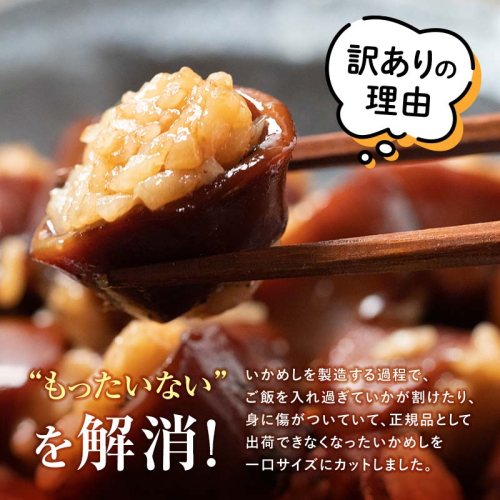 こちらのカット済訳ありいかめしは、いかめしを製造する過程で、ご飯を入れ過ぎていかが割けたり、身に傷がついていて、正規品として出荷できなくなったいかめしを一口サイズにカットしました。