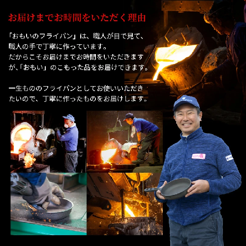 株式会社wajiの職人の手で機能面やデザイン面の質を限りなく落とすことのないように、デザイン・パターン・製造の全てを創意工夫し製品開発を行うことで、廃棄を極限まで抑え、仕立てた製品です。おもいのフライパンのロゴマークを刻印しました。