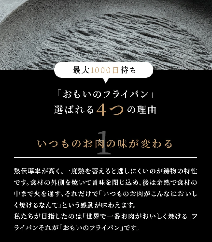 おもいのフライパン26cm《頂-ITADAKI-》は、焼き面に高低差と広狭差を付けることで、食材への熱伝導が不規則になり遠赤外線効果がより優れたものとなっております。ご家庭で、一流レストランと同等の美味しさを手軽に味わえるように設計しました。ステーキの代表的なサーロインステーキが2枚焼けるサイズのフライパンです。