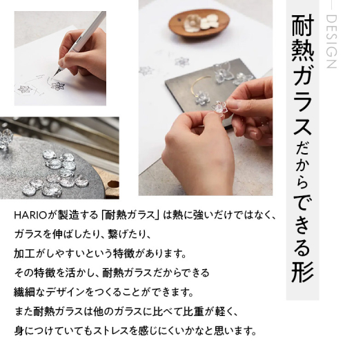 1921年創業の耐熱ガラスメーカーHARIOが職人の手仕事技術の継承のためにつくりはじめたガラスのアクセサリー。古河の工房で、ひとつひとつ手作りでつくられています。