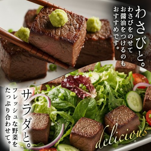 宮崎牛の柔らかく甘みのあるロース肉を、ぜいたくにもサイコロ状にカットしてお届けします。 わさび醤油であっさりいただくと脂のしつこさも消え、よりロース肉を堪能いただけます。