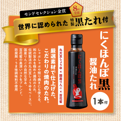 大自然の澄んだ空気、山から湧き出る新鮮な水。生き物にとって最高の環境で国産飼料用米を食べて育てました。脂は白く、赤身はより赤い美しい肉に仕上げています。また、モンドセレクション7回金賞受賞のオリジナル焼肉のタレ「にくほんぽ黒」を1本お付けいたします。本来は焼肉のタレですが、牛丼のタレとしてもご利用いただけますので、是非ご活用ください。