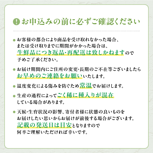 最高級ランクとあったので昨年、先行予約しましまたが9月上旬発送と書いてたので9月入ってからの発送かと思っていたら発送連絡もなく8月に届いた。色は悪いし粒も不揃いでこれで最高級ランクを売りにしてるなら二度と買いません。山形のシャインマスカットなら間違いないと思っていたのでホントにガッカリです。皆さん、先行予約は気をつけてください。