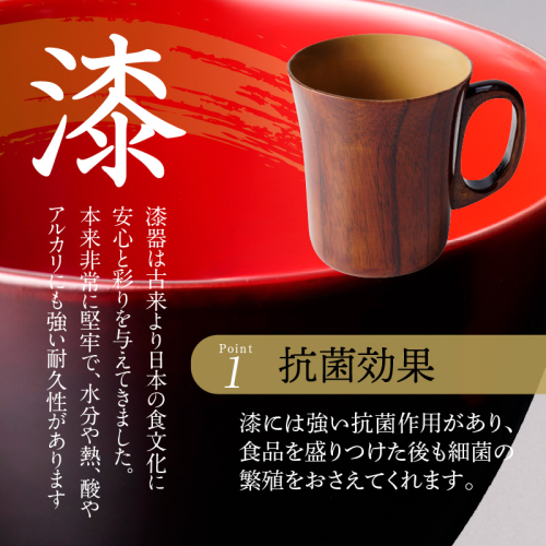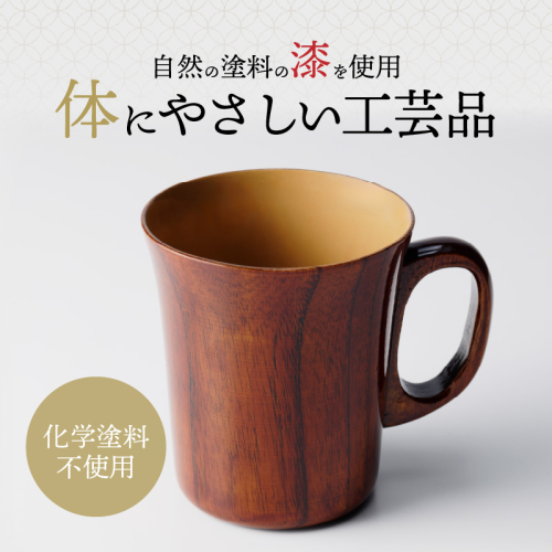 直接口にするものなので化学塗料を使用せず、自然の塗料の漆を使用した、体にやさしい工芸品です。 芸術性のみならず、実用性も兼ね備えた漆器は抗菌性にも長けており、美味しく安全な食事に最適です。 熟練の職人が一つ一つ心を込めて手作りしたマグカップで上質な毎日の食事をお楽しみください。 ※返礼品の重量や付加価値の半分を一定程度上回る割合が小牧市内で行われる工程によるものである。なお、小牧市内で行われる工程は、木の器の仕入れ、漆の塗布である。
