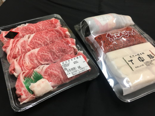 近江牛のすき焼き用と近江八幡名物「丁字麩」「赤こんにゃく」そして当店オリジナルわりしたをセットにしております。