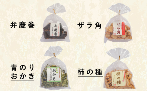 弁慶巻70g、ザラ角100g、青のりおかき100g、柿の種100g、ミックスおかき110g、シオあられ110g、はちみつ入りあられ110g、もち米ポン130g