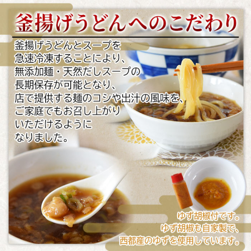 釜揚げうどんとスープを急速冷凍することにより、 無添加麺・天然だしスープの長期保存が可能となり、 店で提供する麺のコシや出汁の風味をご家庭でもお召し上がりいただけるようになりました。 -------------------------------------- 原材料名 【プレーン麺】 小麦粉(国内製造)、食塩 【ゆず麺】 小麦粉(国内製造)、ゆず粉、食塩 【つゆ】 だし(かつお節、さば節、いりこ、昆布)、醤油、味醂、砂糖、食塩/カラメル色素、調味料(アミノ酸等)、甘味料(サッカリンNa、甘草、ステビア) 【具】 ねぎ、天かす(小麦粉、植物油脂)、ベーキングパウダー 【ゆず胡椒】 ゆず、赤唐辛子、米麹 (一部に小麦・さば・大豆を含む) 保存方法 -18℃以下で冷凍保存 ギフト対応 ※のし等のギフト対応をしておりません。ご了承ください。 【地場産品に該当する理由】 高鍋町内で加工(調理)をすべて行っているため。(告示第5条第3号に該当)