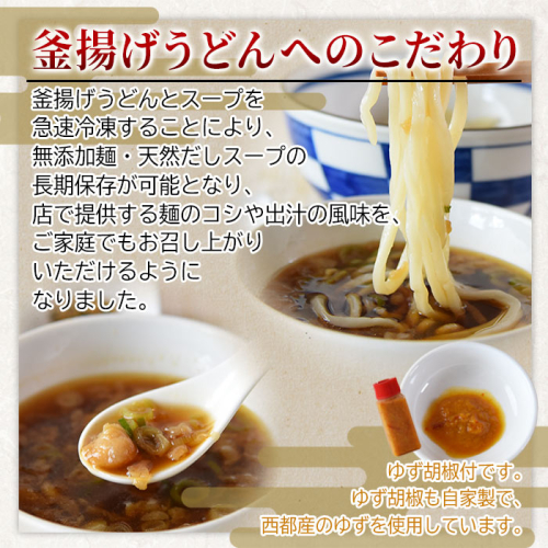 釜揚げうどんとスープを急速冷凍することにより、 無添加麺・天然だしスープの長期保存が可能となり、 店で提供する麺のコシや出汁の風味をご家庭でもお召し上がりいただけるようになりました。 --------------------------------------------------- 原材料名 【麺】 小麦粉(国内製造)、食塩 【つゆ】 だし(かつお節、さば節、いりこ、昆布)、醤油、味醂、砂糖、食塩/カラメル色素、調味料(アミノ酸等)、甘味料(サッカリンNa、甘草、ステビア) 【具】 ねぎ、天かす(小麦粉、植物油脂)、ベーキングパウダー 【ゆず胡椒】 ゆず、赤唐辛子、米麹 保存方法 -18℃以下で冷凍保存 ギフト対応 ※のし等のギフト対応をしておりません。ご了承ください。 【地場産品に該当する理由】 高鍋町内で加工(調理)をすべて行っているため。(告示第5条第3号に該当)