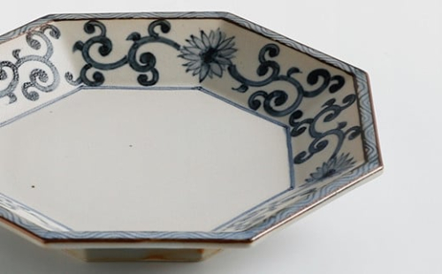 有田の真っ白な磁器とは一味違う少し黄味がかった素地に、 渋い藍色の古染付、茶色の渕錆が映えます。 よく見ると細かい貫入が入っており、見れば見るほど惹きこまれます。 高級感あふれる和の食卓を演出できる、絵変りの八角皿2枚セットです。 取皿やお茶菓子を載せるお皿にぴったりです。 和の形状ですが洋食にも活躍します。 ※こちらの徳幸窯「古染」シリーズですが、古陶磁の風合いを出すため、昔風の釉薬を使って普通の有田焼とは異なる特殊な焼き方をしており、焼きムラが出やすくなっております。 窯元:徳幸窯 提供:ヤマト陶磁器株式会社