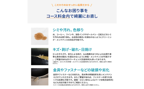 バッグのクリーニング(洗い)からキズや擦れの修復、色補正、仕上げまで全てがセットになったコースです。