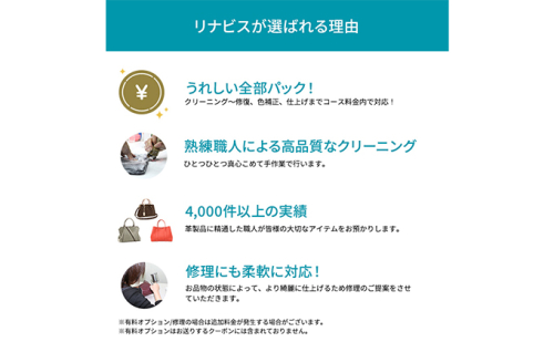 ・本クーポンは「リナビス」の靴クリーニングコースにご利用いただけるクーポンです。その他のクリーニングプランにはご利用いただけませんのでご注意ください。
