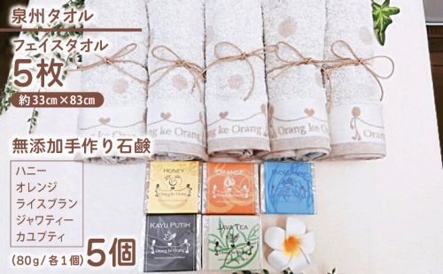 【スピード発送】無添加手作り石鹸付泉州タオルセット 【ハニー,オレンジ,ライスブラン,ジャワティー,カユプティ】 099H3752 494715 - 大阪府泉佐野市