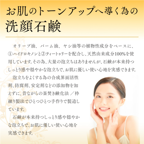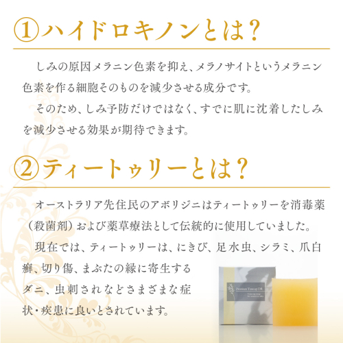 オリーブ油、バーム油、ヤシ油等の植物性成分をベースに、(1)ハイドロキノンと(2)ティートゥリーを配合し、天然由来成分100%を使用しています。