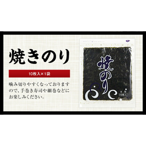 地場産品基準 告示第5条第セット号に適合 適合理由:焼きのり【3号】 近海で採れた海苔等の乾燥・加工、パッケージに至る全ての工程を行うことで、本工程による付加価値は返礼品の付加価値のうち50%以上を占めているため。