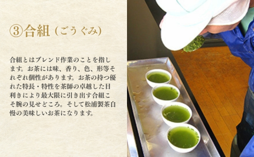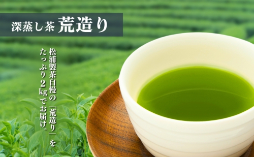 一番茶を深く蒸し、自然の風味を大切に揉み上げ、茶の芽、葉、茎、粉の特長を最大限に活かした匠の技が光る絶妙の荒茶仕上げです。火入れ法を駆使し、深むし茶特有の濃厚な水色はそのままに焙煎香のあるお茶に仕上げました。渋みが少なく、コクのある深い味わいと際立つ香りの松浦製茶自慢の『荒造り』をご賞味ください。