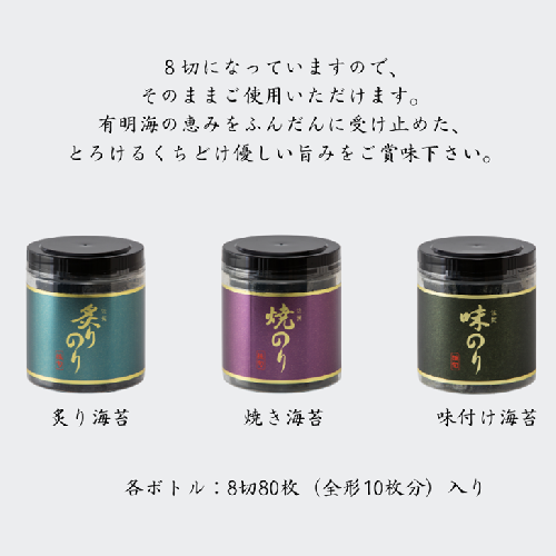 焼き海苔、味付け海苔、炙り海苔の3本入り。