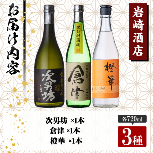 <水割りBセット>店主が選んだ「次男坊・倉津・橙華」(合計3本・各720ml)国産 セット 詰め合わせ 芋 本格焼酎 芋焼酎 お酒 アルコール【岩崎酒店】akn019-23
