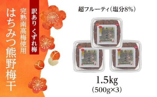 完熟南高梅使用 くずれ梅 はちみつ熊野梅干1.5kg(500g×3) 超フルーティ(塩分8%)【訳あり】