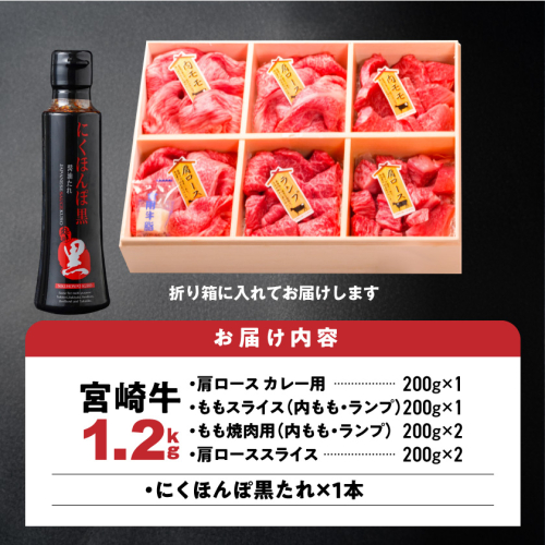 宮崎県産宮崎牛肩ロースともも肉を4種カットにして、折り箱に入れてお届けします。 様々なお料理でお楽しみいただけるようカットしております。 口の中に広がる肉汁の風味と旨みをご堪能ください。 また、モンドセレクション金賞受賞のオリジナル焼肉のタレ「にくほんぽ黒」を1本お付けいたします。 本来は焼肉のタレですが、炒め・煮込み料理など万能にご利用いただけますので、是非ご活用ください。