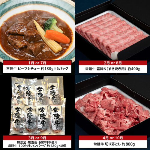 【茨城県共通返礼品】【定期便】【6回コース】 常陸牛 贅沢 満喫 定期便 (6ヶ月連続でお届け) 半年 牛肉 黒毛和牛 国産 切り落とし すき焼き 焼肉 霜降り ステーキ ハンバーグ ローストビーフ [AU033ya]