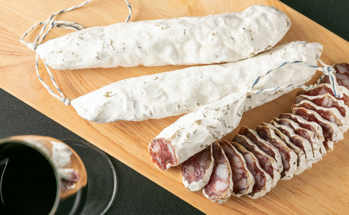 フランス3都市「トゥール・リヨン・オランジュ」でシャルキュトリーの修行をし、帰国後、高山の名店「キュルノンチュエ」の番頭、責任者として7年勤務したのちMontbazonオープン。フランス製法にこだわり、ひとつ一つ丁寧に時間をかけて仕上げます。当店人気商品の白かびサラミは腸詰めしたソーセージにカマンベールチーズと同系統の白かび菌を植え付け約3週間の熟成・乾燥で仕上げます。当店自慢の8種類の詰め合わせです。