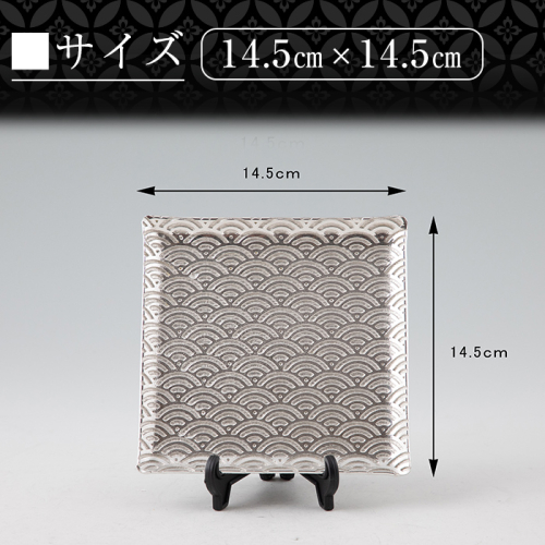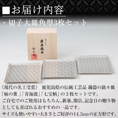 《100年以上の老舗店・薩摩錫器工芸館》 切子大皿角型 「麻の葉」「青海波」「七宝柄」 3枚セットです。 ご自宅でのご使用はもちろん、新築、開店、記念日の贈り物としても喜ばれるおすすめの一品です。 サイズも縦横14.5センチの正方形、ちょうどよいサイズで使いやすいとご好評いただいています。 現代の名工受賞 鹿児島県の伝統工芸品、錫器の銘々皿はいかがでしょうか? 【薩摩錫器とは】 鹿児島県霧島市を代表する伝統工芸品です。 300年の歴史を持つ薩摩藩ゆかりの錫細工です。 錫器は使うほどに味わいが出て手にするとずっしりと重みと温かさがあります。 薩摩錫器工芸館 株式会社 0995-45-0177 《地産理由》市内で製造・加工された工芸品