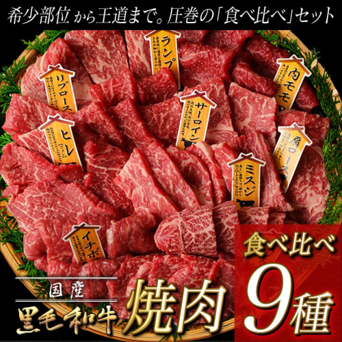 黒毛和牛の魅力を存分に味わえる、食べ比べ9種盛り!! 部位ごとの違いを感じながら、美味しく楽しくお召し上がりください! ※冷凍配送のため、肉色が濃くなることがございますが、品質や味に問題はございません。安心してお召し上がりください。 ≪解凍方法≫ ・調理される前日に冷蔵庫に移して、ゆっくりと解凍してください。 ・解凍の際、若干量のドリップ(水分等の流出)が発生する場合がございますが、品質には問題ございません。