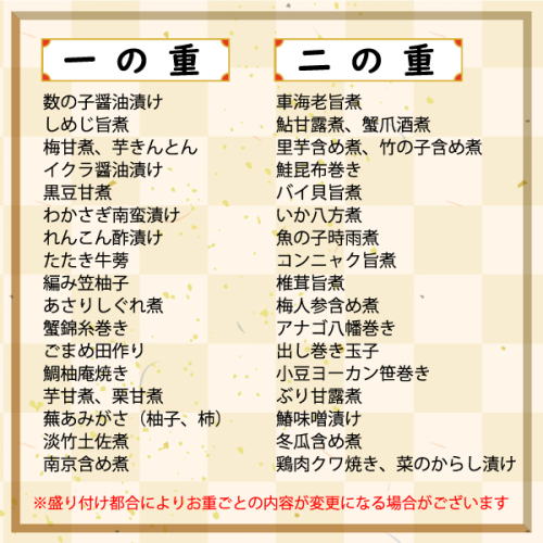 【一の重】数の子醤油漬け、しめじ旨煮、梅甘煮、芋きんとん、イクラ醤油漬け、黒豆甘煮、わかさぎ南蛮漬け、れんこん酢漬け、たたき牛蒡、編み笠柚子、あさりしぐれ煮、蟹錦糸巻き、ごまめ田作り、鯛柚庵焼き、芋甘煮、栗甘煮、蕪あみがさ(柚子、柿)、淡竹土佐煮、南京含め煮
