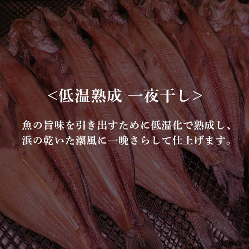 <低温熟成一夜干し>…魚の旨味を引き出すために低温化で熟成し、浜の乾いた潮風に一晩さらして仕上げます。