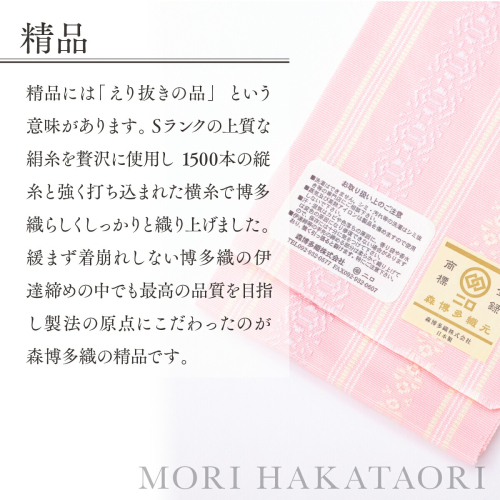 精品には「えり抜きの品」という意味があります。Sランクの上質な絹糸を贅沢に使用し1500本の縦糸と強く打ち込まれた横糸で博多織らしくしっかりと織り上げました。緩まず着崩れしない博多織の伊達締めの中でも最高の品質を目指し製法の原点にこだわったのが森博多織の精品です。