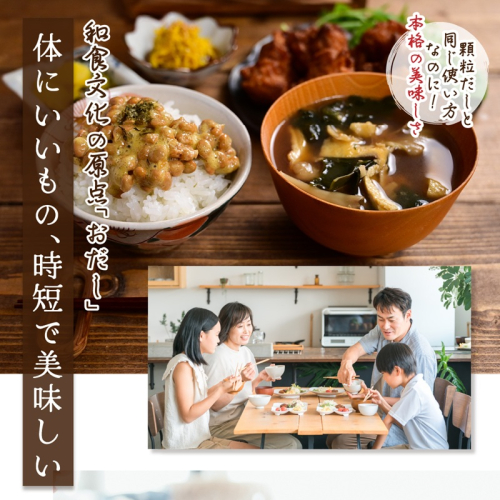 【説明】顆粒ダシと同じ使い方で、無添加の美味しさ。本格の味を手間いらずでお楽しみいただけます。お湯を注ぐだけでおいしい枯れ節のダシをご堪能いただけます。本品は塩も砂糖も不使用なので、塩分が気になる方も安心してお使いいただけます。職人が一本一本丁寧に選別した上質品だけを原材料にしています。微粉末加工の「粉挽だし+こんぶ」は、ふりかけ、おにぎり、納豆に和えたりと、幅広い料理にご活用いただけます。