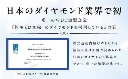 株式会社内原はWDCから招待を受け加盟が認められた、日本のダイヤモンド業界初であり、唯一の加盟企業です。