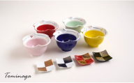 桜楕円皿は少し深みがあり煮魚、刺身、サラダ等和洋いろんな料理に使えます。 さほど大きくはなく、女性用の器としていかがでしょうか。どちらの向きでも重なり収納も良く大変使いやすい器です。  花渕小鉢は高台で低い器との高低のバランスがあり見栄えが良く、料理を盛っても映えます。 青、赤吹き十角杯(口部の所十角)は日本酒に合い、持ち手も持ちやすくなっています。 窯元:貞陸 聖陶苑 提供:富永陶磁器