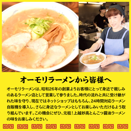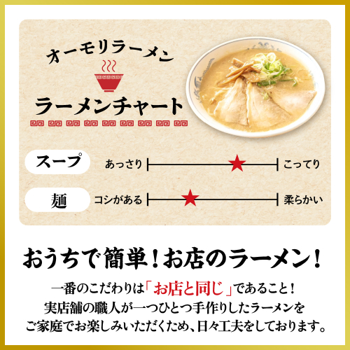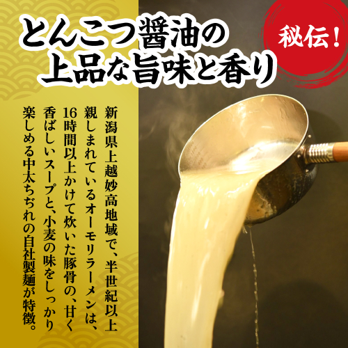 ■説明 新潟県上越妙高地域で半世紀以上慣れ親しまれているオーモリラーメンは、16時間以上をかけて炊いた豚骨の甘く香ばしいスープと、小麦の風味をしっかり楽しめる中太ちぢれの自社製麺が特徴です。 ■原材料 めん(小麦粉(国内製造)、食塩/加工でん粉、酒精、かんすい)、具入りスープ(豚骨、豚肉、醤油(小麦・大豆を含む)、メンマ、食塩、三温糖、生姜、ごま油/調味料(アミノ酸等)) ■注意事項 ※沖縄県・離島へは配送できません。 ※画像はイメージです。 ※不在票が入っていた場合は、速やかに再配達依頼を行ってください。保管期間が過ぎて返送されてしまった返礼品の再配達はできかねます。 ※全て手作業の為大量生産ができません。ご注文が多数の場合はお届けまで少々お待たせしてしまいますが、どうぞ宜しくお願い申し上げます。