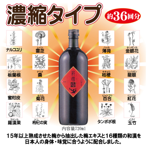 15年以上永年熟成した貴重な梅エキス+16種類の和漢(霊芝・棗・菊花・枸杞の実・ナルコユリ・板藍根・蜜柑皮・羅漢果・金銀花・龍眼・紅花・玉竹・薄荷・桔梗・百合・タンポポ根)