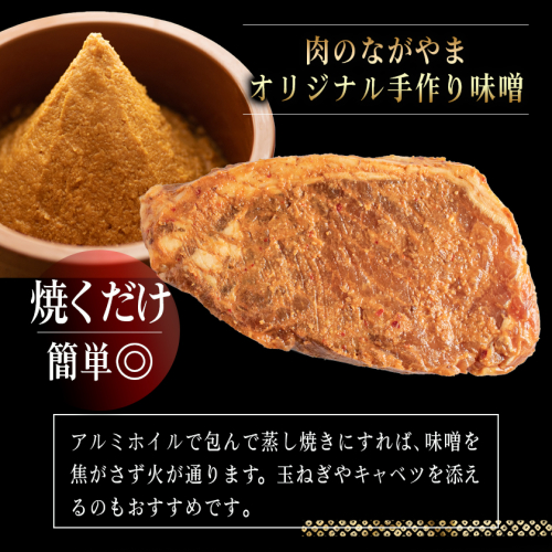 肉のながやまオリジナルの手作り味噌で漬け込んだ豚ロース味噌漬けを3枚ずつ真空パックにしてお届けします。