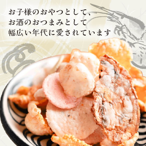 えびの旨味をダイレクトに味わえる定番えびせんや、イカなどの海鮮や梅やわさびなどさまざまな素材と組み合わせたおせんべいは、1袋でいろんな味が楽しめ、一つまたひとつと手がのびて止まらない!
