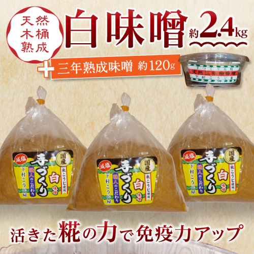 【説明】活きた糀の力で免疫力アップして下さい!!老舗こうじ屋の木おけ仕込み。北海道産丸大豆、国産米を使用し、職人が造り上げた一品です。糀をすり込んだ白味噌を長期熟成させた三年味噌のコクと旨みを味わってください。(要冷蔵) 【内容】白味噌約800g×3、三年味噌:約120g 【産地】焼津市内 【製造】焼津市内 【加工】焼津市内 【賞味期限】冷蔵で6ヶ月 【発送期日】約1~5週間で発送※異なる場合は説明文記載 【アレルギー】28品目中:大豆 【申込期日】通年 【注意事項・その他】※時期により内容等が変更になる場合がございます。 【配送方法】冷蔵 【提供元】下村こうじ屋