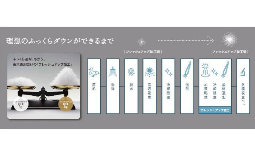ふとんの西川が厳選した羽毛と独自の技術で創りあげたシリーズ。羽毛は寒冷地にて育ったホワイトグースを自ら買い付けて自社工場で加工。ふとんの側生地には、軽く柔らかな天然素材を厳選。キルティングにも良質な素材を活かすよう、独自の工夫を施しました。
