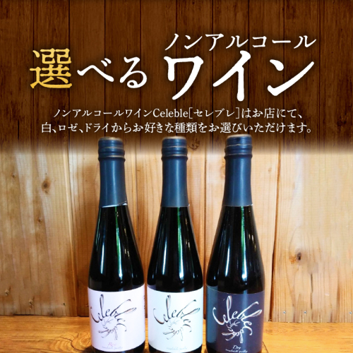 ノンアルコールワインCeleble[セレブレ]はお店にて、白、ロゼ、ドライからお好きな種類をお選びいただけます。
