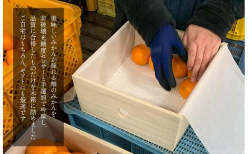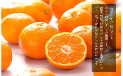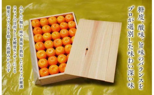 長年みかんに触れているみかんの会スタッフが厳選しました。美味しいみかんが採れる畑をピックアップし収穫されたみかんを非破壊光糖度センサーと手選別で厳選し、品質に合格したみかんだけを一玉一玉丁寧に木箱に手詰めした高級みかんです。糖度、酸味、旨味のバランスが絶妙でもう一つ食べたくなるめっちゃうまいみかんです。