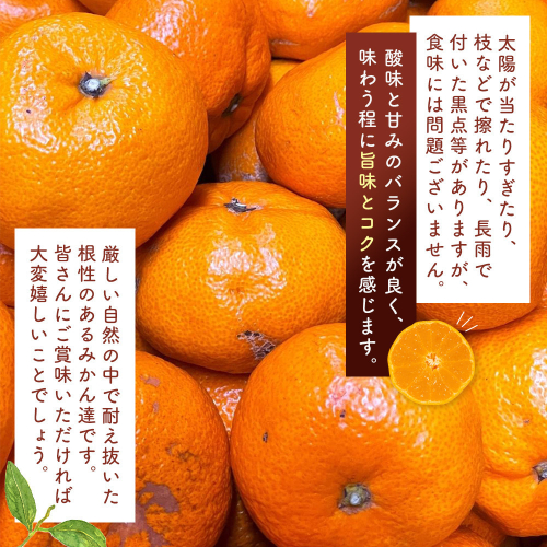 雨にも負けず、風にも負けず、照り付ける太陽にも負けず元気な証をつけて育ったみかん。美味しいみかんを作るための作業や努力は同じなので一皮剥けば食味は有田みかんそのものです。