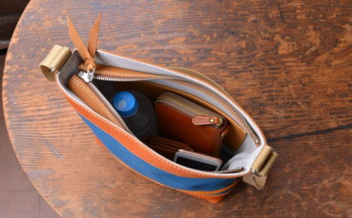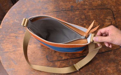 ここ近江八幡は、明治時代、県内の有志が集まり、国内初の西欧式帆布製造を完成しました。こういった歴史的なモノづくり精神にインスパイアされ、滋賀県で作られた帆布を使った八幡帆布鞄を作りました。八幡堀近くの工房で一つ一つ丁寧に鞄を手作りしております。使用している帆布は8号帆布で耐久性も高く、革も国内で作られている高級なものを使用しております。デザインは、八幡堀をイメージし、古い中にも新しさがある、レトロモダンをイメージして作っております。幅広い年齢層の方にご支持をいただき、最近は海外の旅行者様にも人気のアイテムとなっております。こちらのモデルは裏地が付いており、ポケットがひとつ付いております。バッグの口の部分にはファスナーが付いていますので、安心してご利用いただけます。